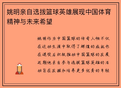 姚明亲自选拔篮球英雄展现中国体育精神与未来希望