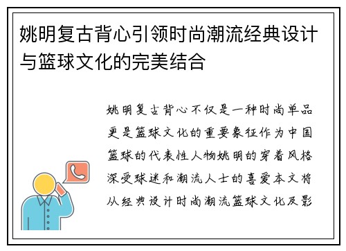 姚明复古背心引领时尚潮流经典设计与篮球文化的完美结合